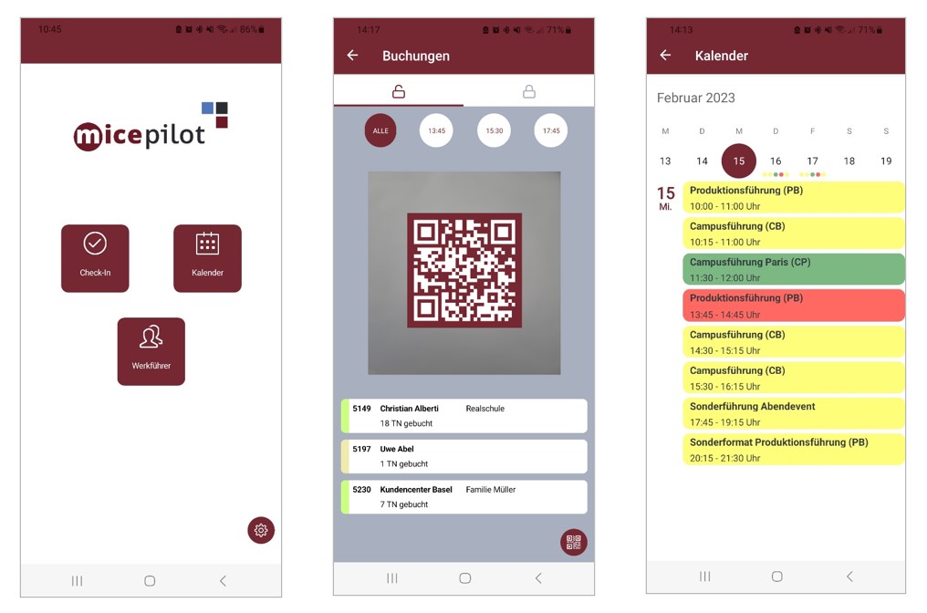 Die MICE-Pilot App ermöglicht Ihnen und Ihren Mitarbeitenden das Einchecken Ihrer Gäste mit Einblick in Buchungsdetails, eine aktuelle Übersicht zu den Veranstaltungen der Woche inkl. der Auslastung der einzelnen Events und einen Zugang für Ihre Guides mit einer Übersicht der ihnen zugeschlüsselten Touren.